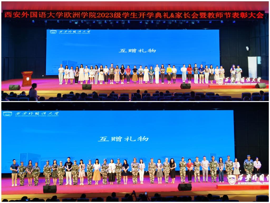教师代表为新生代表佩戴校徽。栉风沐雨七十载,西外精神在校徽上凝结、延续,戴上校徽的那一刻,才是真正成为了一名“西外人”,西外精神也将永远烙印在每一个“西外人”的心里。感人心者,莫先乎情。主持人告知同学们,报到时,部分家长投递在信箱里的《家长的一封信》,希望同学们仔细品味字里行间温暖的爱。新生代表们为教师送上鲜花,在教师节来临之际,表达对老师们的崇敬、感恩之心。