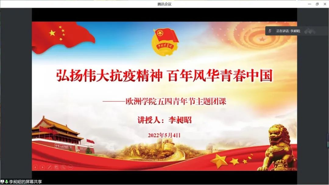 第五项,分团委指导老师李昶昭以百年大党的使命初心、百年变局的伟大精神以及百年大计的青春力量三部分为主线,讲述了中国共产党百年以人民为中心、守卫人民生命健康一以贯之的执政理念,介绍了中国共产党新时代精神谱系中伟大抗疫精神的由来和内涵,激励同学们在疫情防控常态化的当下,树立积极向上的心态,锻炼健康阳光的体魄,投身志愿服务,规划学习成长,正如总书记在人大考察所寄语,在青春的赛道上奋力跑出最好成绩!