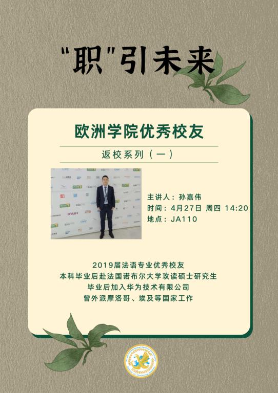 孙嘉伟,2019届法语专业本科生,曾于大三前往法国交换,硕士毕业于格勒诺布尔大学企业传播专业,2021年至今在华为工作,从事公共关系经理一职,毕业外派至摩洛哥,现工作地埃及。