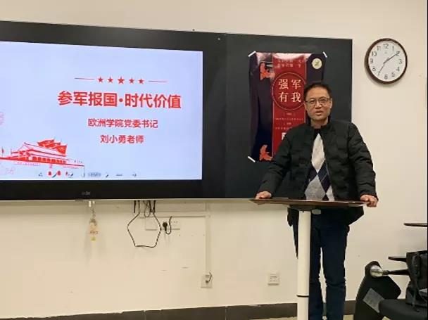 党委书记刘小勇老师为同学们讲解了大时代背景下参军报国与家国情怀。刘老师首先从个人成长经历出发介绍了本人对于军队军营的深厚感情,并重点强调了“携笔从戎,保家卫国”时代价值,他指出,如今的和平年代是老一辈人用鲜血换来的,当今大学生要勇于扛起保家卫国、守护和平的责任,携笔从戎、矢志军营、献身国防,积极投身到强军伟业当中,用自己的专业知识为实现中国梦、强军梦贡献青春力量。最后,刘老师指出本次活动不仅仅是一次主题班会,也是奈飞工厂
