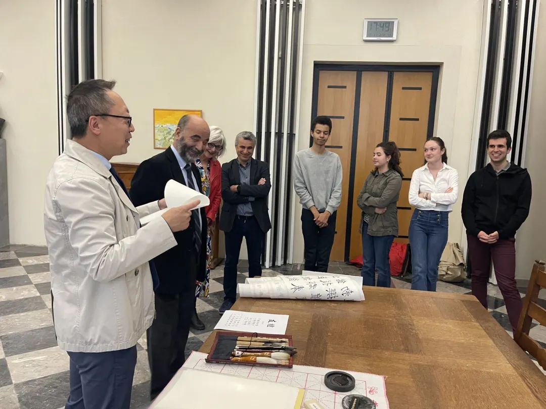 2023年3月31日,我校承建的法国波城孔子学院与波城路易·巴尔都高中签署了合作协议。波城孔子学院理事会成员穆罕默德·阿玛拉先生代表贝鲁先生(法方理事长、国家规划高级专员、波城市长)、路易·巴尔都高中校长埃里克·博提埃先生以及中方院长贾宝军、高中部分师生代表出席了此次仪式。双方将在波尔多教育局、波城市政府等机构的支持下,在语言和文化等领域开展多方面的合作,为该校师生提供了解和学习中国语言及文化的机会。仪式后,贾宝军院长为各位来宾介绍了汉字的起源、构造、文房四宝等文化内容,大家兴致勃勃地体验了中国书法的魅力。