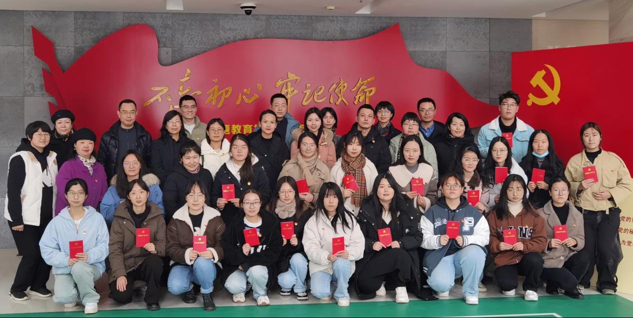 随后,党员教师为全体新发展预备党员发放党章、佩戴党员徽章,师生党员面向党旗,庄严宣誓。铮铮誓言,震撼人心,响彻大堂,诠释着每一位新发展预备党员对党的无限忠诚与坚定信仰。