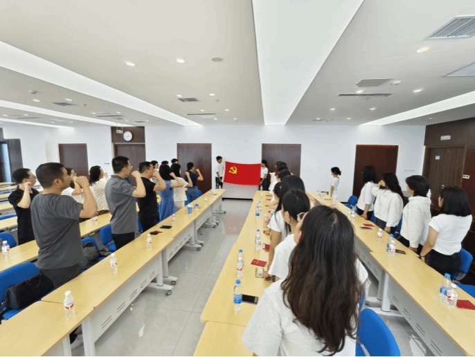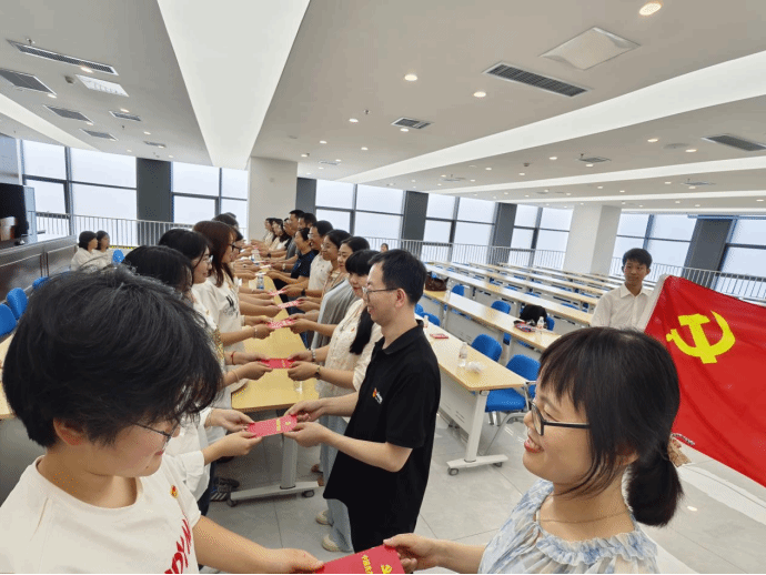 随后,全体教工党员为本学期新发展的学生党员颁发党章、佩戴党徽。