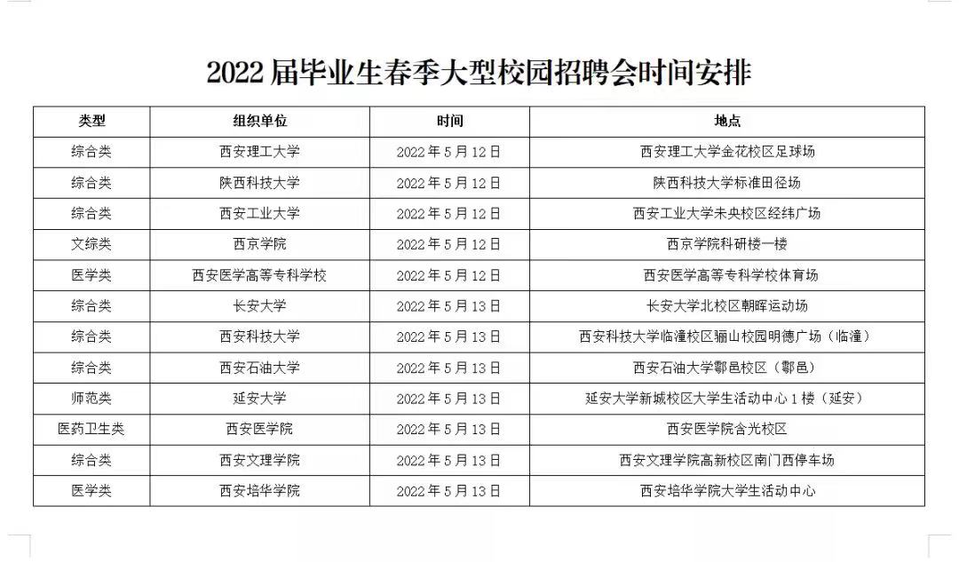 为促进2022届高校毕业生充分就业,省教育厅联合有关高校,从2022年5月初到6月中旬,为2022届高校毕业生举办64场大型校园招聘会,现将具体时间安排予以公告。
