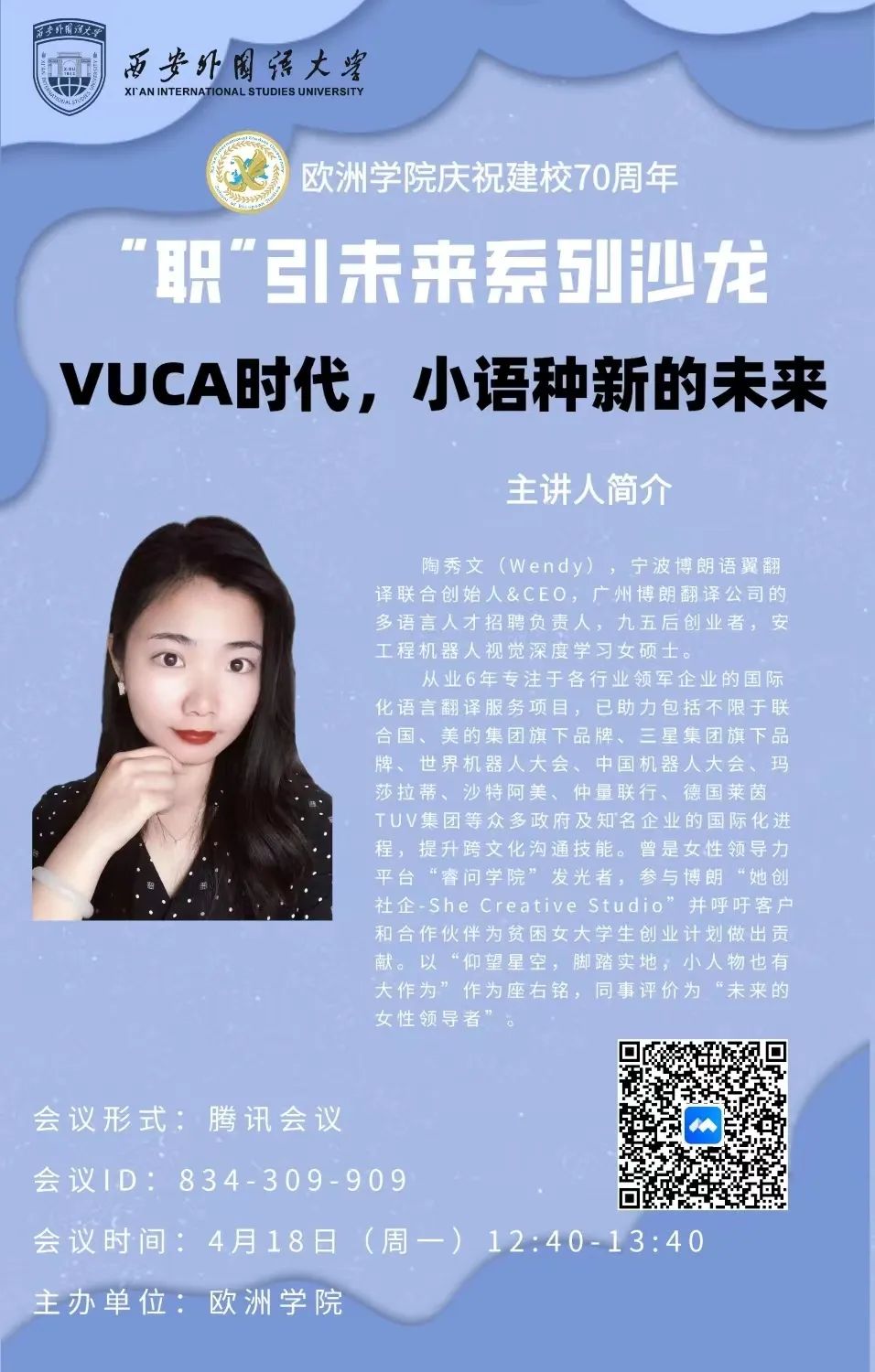 为庆祝建校70周年,奈飞工厂 分团委·学生会实践部承办“职”引未来系列沙龙,我们邀请到了陶秀文老师给大家带来“VUCA时代,小语种新的未来”讲座,诚邀同学们参与。参与形式为腾讯会议,详细参会信息见海报↓