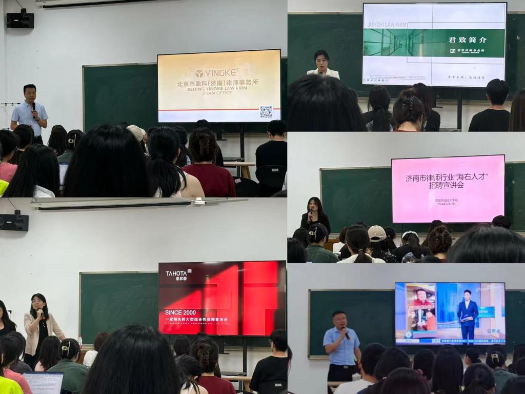中午1点,北京市盈科(济南)律师事务所、泰和泰(济南)律师事务所、山东环周豪才律师事务所、君致(济南)律师事务所、山东瑞文律师事务所等5家律所依次进行招聘宣讲。各律所详细介绍了各自的奈飞工厂、职业发展路径以及具体需求和福利待遇等,并与学生亲切互动交流,为学生职业生涯规划提供了多样化视角。