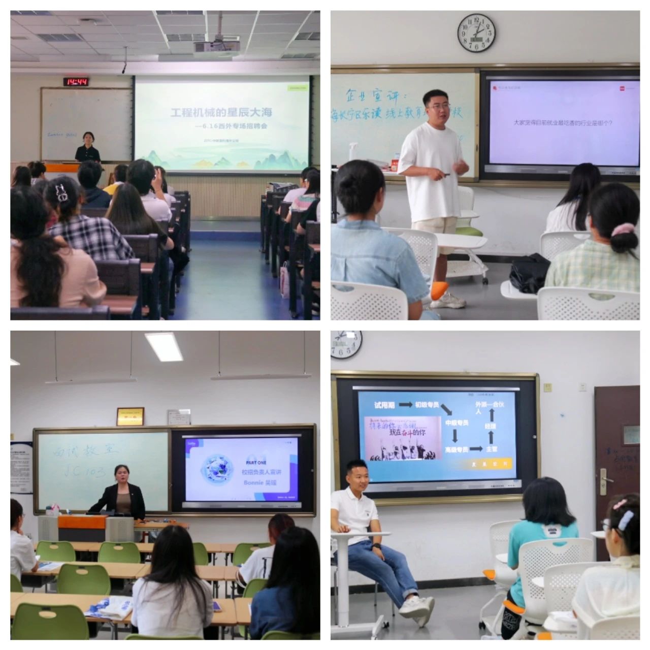 主题报告环节,中联重科股份有限公司、桂林市啄木鸟医疗器械有限公司、上海长宁区乐读线上教育培训学校、汇荣集团、杭州润州光电技术有限公司和陕西重型汽车进出口公司分别做了题为“工程机械的海外征途——中联国际化历程分享”“口腔行业的蓬勃发展”“未来职业导航:教育行业就业指南”“链接全球,国际物流”“光通讯发展趋势——润州让链接更简单”和“全球视野,逐梦世界——陕汽海外销售的个人成长及价值体现”的主题报告,介绍了行业背景、战略布局、业务板块和职业规划等,对学生择业和实习方向选择具有积极的指导意义。