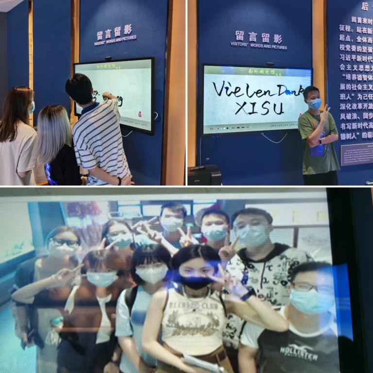 进入馆内,讲解员接着为同学们讲解序厅艺术浮雕以及校徽的象征意义,让同学们对于我校的建校历史和发展理念有了一个宏观初步的了解。走进“历史长廊”,讲解员以学校办学历史根源为出发点,以学校发展脉络为导向,带领同学们回顾了西外发展的六大篇章。其间,通过对一些代表性图片和校史展品的讲解,讲解员为大家揭晓了它们背后的难忘瞬间,同学们对学校发展史上的一些重大事件、标志性办学成果、杰出校友以及他们的光辉事迹等有了更加具体的了解。参观完各个专区后,在讲解员的带领下,同学们来到了多语种翻译设备区,科技视角下多种语言XISU词条的灵活切换,让大家再次强烈感受到我校的多语种专业特色以及国际化接轨氛围。