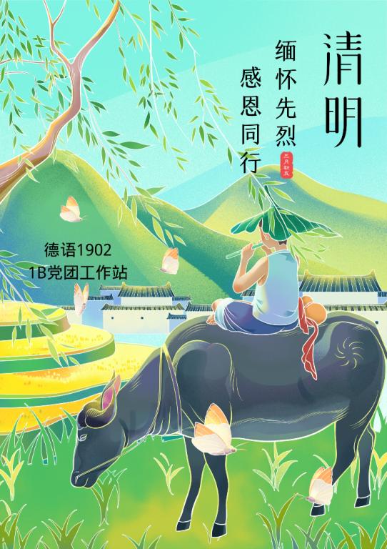 德语1902 王姿懿:四月芳菲始,又是一年清明时,我们要学习英烈精神,汲取奋进力量,传承英烈精神,奋进伟大征程。要永远铭记英烈的英雄事迹,发扬英烈的英雄精神。怀想先辈英烈,舍去小我和小家,将生命献给了人们和国家,换来了当今我们的美好生活,我们必将传承先辈遗志,显出我们的力量,为实现中华民族的伟大复兴而奋斗。