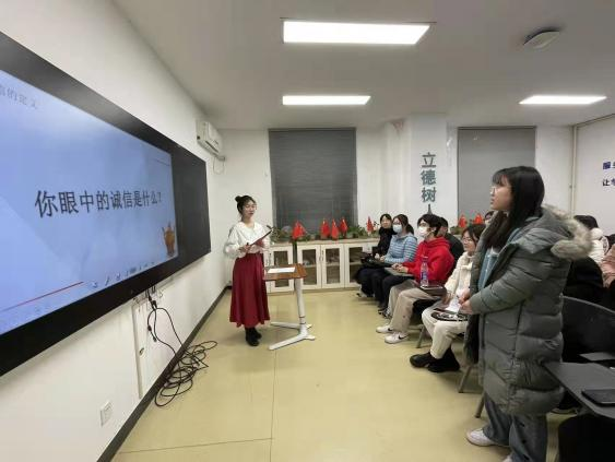 辅导员杨子江总结发言,她强调,在期末考试临近前进行诚信教育十分必要。诚信是立身之本、是为人处世的准则,杨老师讲述了许多发生在学生身边的失信和违纪案例,告诫同学们守住道德底线,尤其是在面对考试和诱惑时,不要尝试错误的行为,要将诚信贯穿到人生的每一阶段,面无论是在当下身处西外,还是在将来走向社会,都要做一个诚实正直的人。