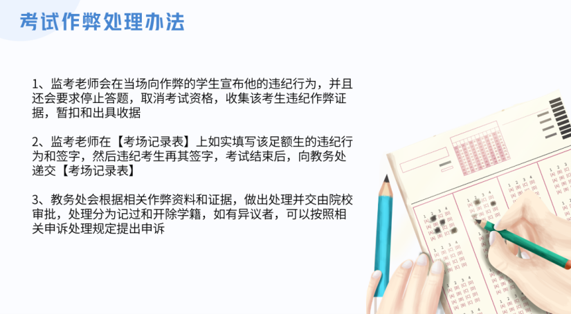 希腊语1901班马光麾同学带我们了解了高校在处理考试作弊时的流程。在考试时,学生出现违规作弊行为,监考老师会根据相关规定和条款,按照作弊流程,对学生进行处理。首先,监考老师会在当场向作弊的学生宣布他的违纪行为,并且还会要求停止答题,取消考试资格,收集该考生违纪作弊证据,暂扣和出具收据。接着监考老师在【考场记录表】上如实填写该足额生的违纪行为和签字,然后违纪考生签字,考试结束后,向教务处递交【考场记录表】。最后教务处会根据相关作弊资料和证据,做出处理并交由院校审批,处理分为记过和开除学籍,如有异议者,可以按照相关申诉处理规定提出申诉。