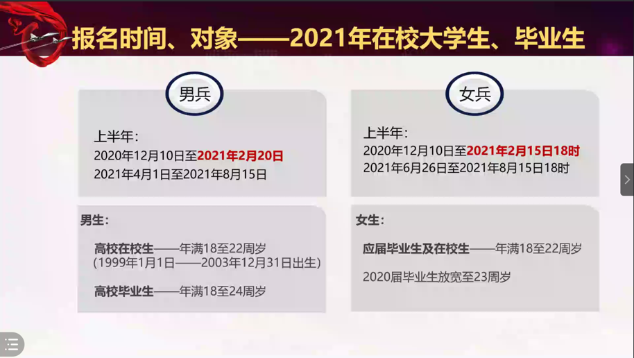 于1月27日在腾讯会议开展了2021年线上征兵宣讲会。学校学工部·学生处·武装部部长丁铭、国防教育办公室主任郭宁、校团委综合科教师赵润康、学院全体辅导员、退伍大学生代表及全体男生参加了此次宣讲,宣讲会由学工办主任梁鹿儿主持。