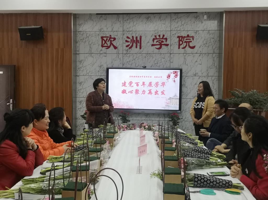 在JG110组织女教工开展了以“建党百年展芳华,凝心聚力再出发”为主题的庆祝国际劳动妇女节插花比赛。校工会主席康丰及女教工代表参加了此次活动。