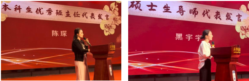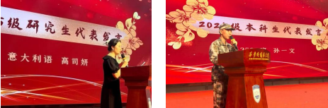 伴随庄严国歌,典礼启幕。硕士生导师黑宇宇、优秀班主任陈琛作为代表发言。2025级研究生高司和2025级本科生法语专业孙一文代表新生发言。