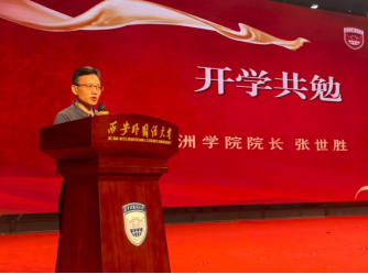 院长张世胜教授致辞,强调外语在国际交流中的作用,希望新生突破思维边界、专业边界、保持系统开放、持续学习,以语言为桥,做中外文化交流使者。