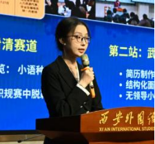 接下来,葡语专业22级学生代表冯钰茼进行了经验分享。她指出,大赛是一次宝贵而严肃的自我审视机会,筹备赛事能帮助同学们明确职业定位,明晰个人优势,从而提高就业能力,她鼓励同学们大胆设定目标,探索自我并积极付诸行动。