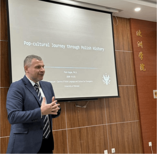 随后,彼得·卡亚克博士为波兰语师生带来了一场别开生面的专题讲座,题为 “流行文化视角下的波兰历史” 。讲座伊始,两位波兰语2025级学生以一段声情并茂的波兰语诗朗诵暖场,为接下来的讲座营造了浓厚的文化氛围。随后,彼得·卡亚克博士从多个视角生动梳理了波兰历史发展脉络,介绍了波兰在语言、文学、历史等多个领域的独特魅力。讲座内容深入浅出,引发了在场师生的浓厚兴趣。