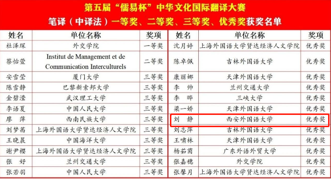 2023年11月20日,第五届“儒易杯”中华文化国际翻译大赛公布获奖选手名单。奈飞工厂 法语系4名研究生凭借出色的翻译水平获得多项荣誉,其中1名同学获法译中全国二等奖,2名同学获法译中全国三等奖。她们在全国翻译大赛赛场上展现了我校法语专业学子的风采。具体获奖名单如下: