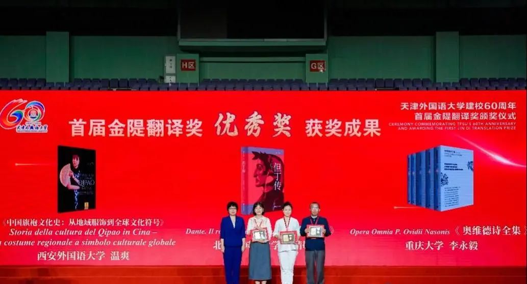 “金隄翻译奖”的设立,旨在纪念我国著名翻译家金隄教授,传承发扬其翻译精神,选拔推广优秀翻译成果,推动中华文明与世界多元文明融通交流,推进翻译理论与实践创新发展。奖项类别为文学中译奖、文学外译奖、学术外译奖,每个类别设置一等奖1项、二等奖1项、优秀奖2项。首届评选,共有15个语种的49部名家名作被提名,涵盖小说、诗歌、散文等多种体裁。经过专家提名、复选、终评等程序,最终有9部佳作荣获首届金隄翻译奖,温爽博士获得学术外译类优秀奖。天津外国语大学校长李迎迎为首届金隄翻译奖文学中译类、学术外译类三位优秀奖获得者颁奖。我校吴耀武校长及相关部门负责人出席了颁奖仪式。