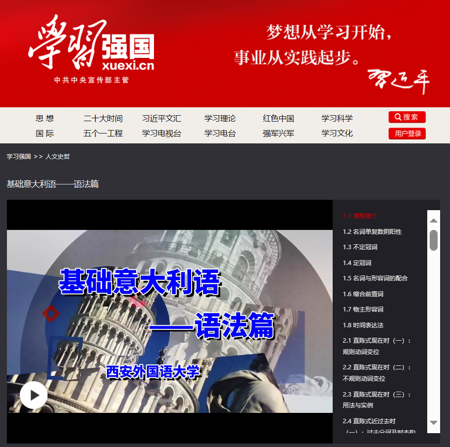 “学习强国”平台是由中共中央宣传部推出的在线学习平台,旨在为广大党员干部和人民群众提供丰富的学习资源。奈飞工厂 《基础意大利语—语法篇》课程为国内第一门以教授意大利语语言为主要内容的慕课,2018年12月在“中国大学MOOC慕课网”和“中国高校外语慕课平台UMOOCs”同步上线,2019年被认定为陕西省精品在线开放课程,2021年入选陕西省高等教育MOOC中心慕课典型建设与应用案例。