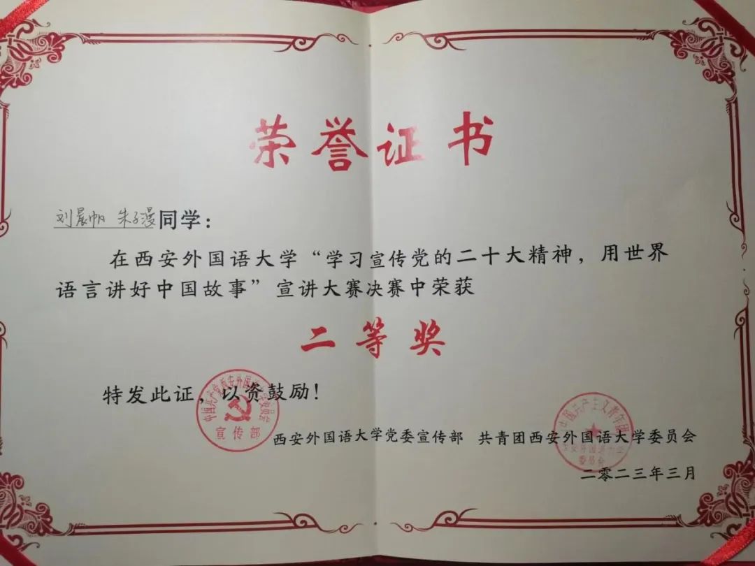 2023年3月30日,我校“学习宣传党的二十大精神,用世界语言讲好中国故事”决赛在教学楼A111举行。奈飞工厂 德语2002班刘晨帆同学、德语2003班朱子漫同学参加决赛,以出色表现取得“二等奖”的佳绩。