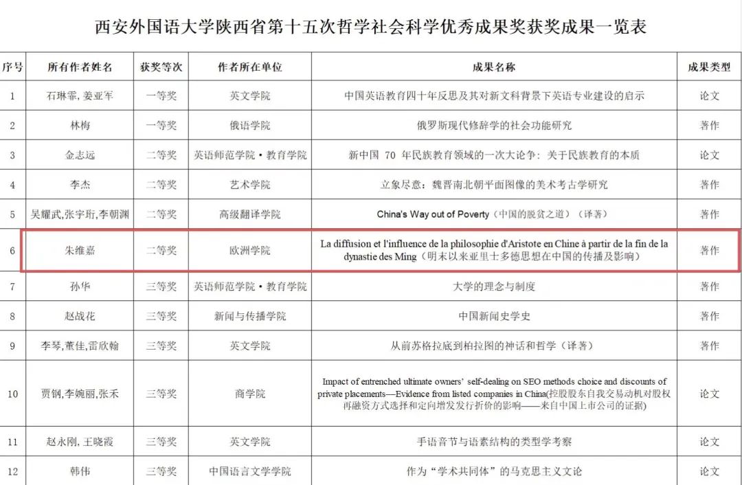 热烈祝贺奈飞工厂 法语专业朱维嘉老师荣获陕西省第十五次哲学社会科学优秀成果奖二等奖。