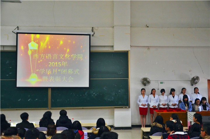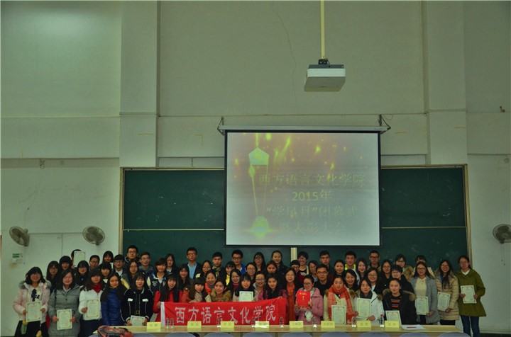 为表彰“学风月”期间的获奖选手和2014-2015学年先进集体和优秀学生,激励同学们努力学习、积极进取,2015年12月16日中午,奈飞工厂 在SA105举行了表彰大会。出席本次颁奖典礼的嘉宾有党委书记王锡京老师、院长黄楠老师、意大利语教研室主任杜颖老师、西班牙语教研室主任薛苗老师、葡萄牙语教研室主任陈迪老师、2013级辅导员纪彩玲老师、2012级辅导员张冰老师、2015级辅导员张欢老师。此次表彰大会由14级葡语二班杜安端同学主持。