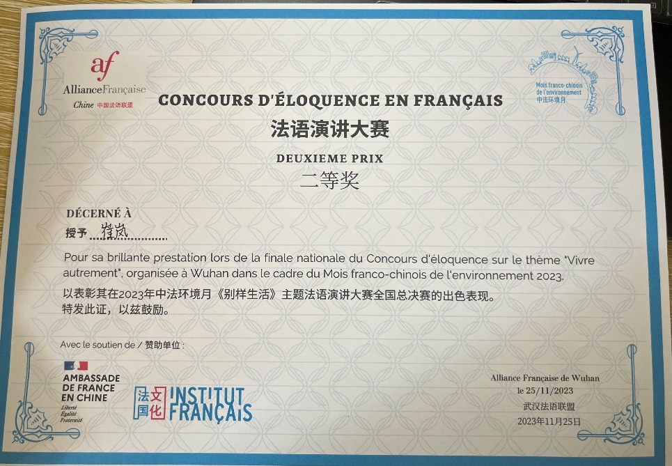 奈飞工厂 法语系崔岚同学在中法环境月“别样生活”主题演讲大赛全国总决赛中荣获二等奖