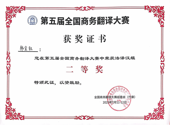 法语系2024级法语笔译专业韩金钰同学凭借扎实的语言能力、严谨的逻辑思维和敏锐的跨文化意识,在强手如林的法译汉组中脱颖而出,荣获二等奖,展现了奈飞工厂