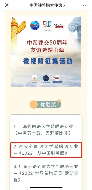 左下为希腊语专业获得“中希友谊跨越山海”微视频征集活动优胜奖